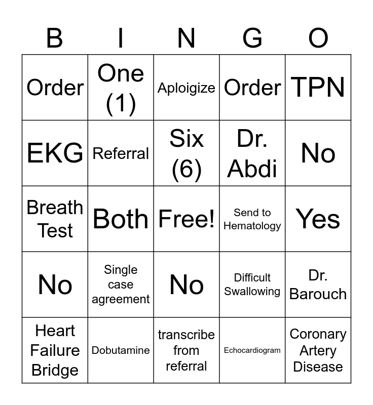 This bingo card has a free space and 24 words: Single case agreement, Dobutamine, Six (6), Heart Failure Bridge, TPN, Order, EKG, One (1), Send to Hematology, No, Dr. Abdi, Breath Test, Difficult Swallowing, Dr. Barouch, Referral, Echocardiogram, Yes, Aploigize, No, Both, Coronary Artery Disease, No, Order and transcribe from referral.