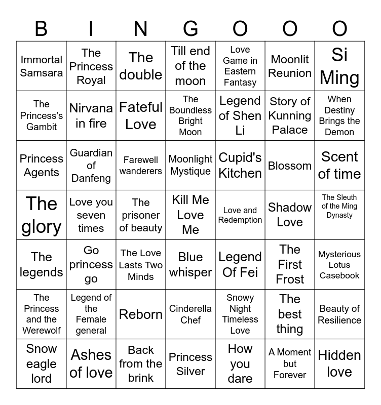 This bingo card has a free space and 48 words: The legends, Love you seven times, Back from the brink, Blue whisper, Legend of Shen Li, Shadow Love, Si Ming, Snow eagle lord, Guardian of Danfeng, The prisoner of beauty, Till end of the moon, Love Game in Eastern Fantasy, Blossom, Scent of time, The glory, Legend of the Female general, The double, Moonlight Mystique, Snowy Night Timeless Love, Moonlit Reunion, When Destiny Brings the Demon, The Princess's Gambit, The Princess Royal, Fateful Love, How you dare, Story of Kunning Palace, The Sleuth of the Ming Dynasty, The Princess and the Werewolf, Go princess go, Farewell wanderers, Cinderella Chef, Cupid's Kitchen, The best thing, Beauty of Resilience, Immortal Samsara, Ashes of love, The Love Lasts Two Minds, Princess Silver, Love and Redemption, A Moment but Forever, Mysterious Lotus Casebook, Princess Agents, Nirvana in fire, Reborn, The Boundless Bright Moon, Legend Of Fei, The First Frost and Hidden love.