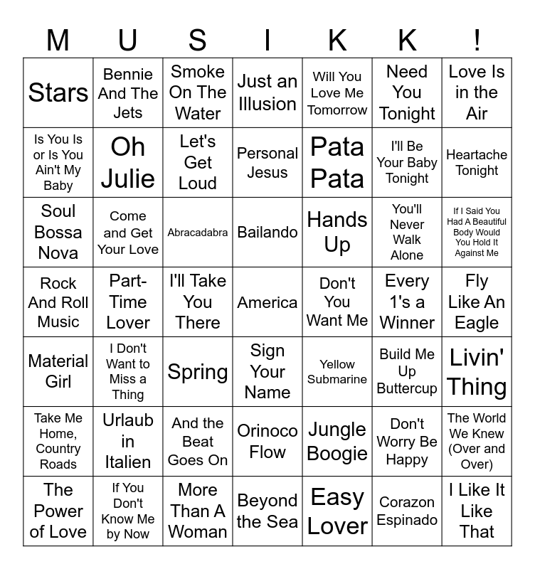 This bingo card has 49 words: Don't Worry Be Happy, I'll Be Your Baby Tonight, Easy Lover, Part-Time Lover, Abracadabra, Fly Like An Eagle, Bennie And The Jets, More Than A Woman, Need You Tonight, Sign Your Name, Love Is in the Air, Just an Illusion, You'll Never Walk Alone, Hands Up, Urlaub in Italien, Every 1's a Winner, Is You Is or Is You Ain't My Baby, Heartache Tonight, The World We Knew (Over and Over), Will You Love Me Tomorrow, Pata Pata, I'll Take You There, Stars, Oh Julie, The Power of Love, Let's Get Loud, If I Said You Had A Beautiful Body Would You Hold It Against Me, If You Don't Know Me by Now, Bailando, Come and Get Your Love, I Like It Like That, Don't You Want Me, Take Me Home, Country Roads, And the Beat Goes On, Rock And Roll Music, Yellow Submarine, Build Me Up Buttercup, Livin' Thing, Soul Bossa Nova, Spring, Orinoco Flow, Material Girl, America, Beyond the Sea, Personal Jesus, Smoke On The Water, Jungle Boogie, I Don't Want to Miss a Thing and Corazon Espinado.