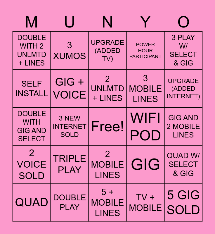 This bingo card has a free space and 24 words: TRIPLE PLAY, DOUBLE PLAY, 2 UNLMTD + LINES, QUAD, 3 PLAY W/ SELECT & GIG, DOUBLE WITH 2 UNLMTD + LINES, SELF INSTALL, 3 XUMOS, WIFI POD, 2 MOBILE LINES, 3 MOBILE LINES, DOUBLE WITH GIG AND SELECT, GIG, QUAD W/ SELECT & GIG, GIG + VOICE, TV + MOBILE, GIG AND 2 MOBILE LINES, UPGRADE (ADDED TV), UPGRADE (ADDED INTERNET), 3 NEW INTERNET SOLD, 5 GIG SOLD, 2 VOICE SOLD, POWER HOUR PARTICIPANT and 5 + MOBILE LINES.