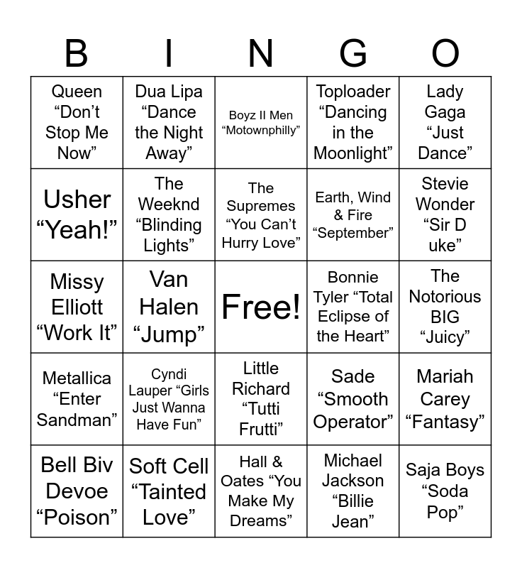 This bingo card has a free space and 61 words: ABBA “Dancing Queen”, Soft Cell “Tainted Love”, Post Malone “Sunflower”, Metallica “Enter Sandman”, Michael Jackson “Billie Jean”, Mark Ronson & Bruno Mars “Uptown Funk”, The Weeknd “Blinding Lights”, Pharrell Williams “Happy”, Earth, Wind & Fire “September”, Outkast “Hey Ya!”, Toploader “Dancing in the Moonlight”, Whitney Houston “I Wanna Dance with Somebody”, Usher “Yeah!”, Kendrick Lamar &SZA “All The Stars”, Nirvana “Smells Like Teen Spirit”, Queen “Don’t Stop Me Now”, Saja Boys “Soda Pop”, Lady Gaga “Just Dance”, Frozen Soundtrack “Let It Go”, The Supremes “You Can’t Hurry Love”, Bonnie Tyler “Total Eclipse of the Heart”, Boyz II Men “Motownphilly”, Bell Biv Devoe “Poison”, Mariah Carey “Fantasy”, Daft Punk “Get Lucky”, BTS “Butter”, Prince “Let’s Go Crazy”, Donna Summer “Hot Stuff”, Stevie Wonder “Sir Duke”, Beethoven “5th Symphony”, Katrina & the Waves “Walking on Sunshine”, Marvin Gaye & Tammi Terrell “Ain’t No Mountain High Enough”, Star Wars Main Theme, Sabrina Carpenter “Espresso”, Dua Lipa “Dance the Night Away”, “Boots on the Ground”, Elvis Presley “Burning Love”, Van Halen “Jump”, Celine Dion “My Heart Will Go On”, Missy Elliott “Work It”, MIA “Paper Planes”, Cyndi Lauper “Girls Just Wanna Have Fun”, The Notorious BIG “Juicy”, TLC “Creep”, Sade “Smooth Operator”, Mary J. Blige “Real Love”, Rihanna “Don’t Stop the Music”, Kool & the Gang “Celebration”, Shania Twain “Man! I Feel Like a Woman”, Little Richard “Tutti Frutti”, Hall & Oates “You Make My Dreams”, Kid Cudi “Up Up & Away”, Shakira “Whenever, Wherever”, Beyonce “Love On Top”, Lady Gaga & Bruno Mars “Die With a Smile”, Spice Girls “Wannabe”, Wham! “Wake Me Up before You Go Go”, George Michael “Careless Whisper”, Kendrick Lamar “Not Like Us”, Flo Rida “Low” and Axel F “Crazy Frog”.