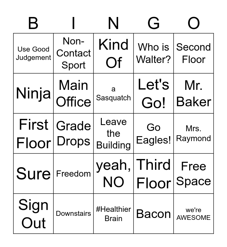 This bingo card has 28 words: Free Space, Google Classroom, Let's Go!, Bacon, Ninja, Kind Of, Non-Contact Sport, Sure, Go Eagles!, Sign Out, First Floor, Who is Walter?, Downstairs, #Healthier Brain, Mr. Baker, ASAP, Freedom, Main Office, a Sasquatch, yeah, NO, Use Good Judgement, we're AWESOME, Leave the Building, Grade Drops, Mrs. Raymond, Third Floor, Second Floor and Cafeteria.