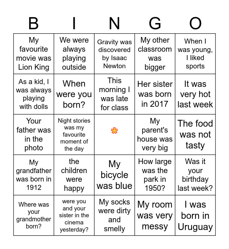This bingo card has a free space and 24 words: the children were happy, were you and your sister in the cinema yesterday?, This morning I was late for class, Where was your grandmother born?, When I was young, I liked sports, My favourite movie was Lion King, As a kid, I was always playing with dolls, We were always playing outside, My parent's house was very big, My bicycle was blue, Her sister was born in 2017, Your father was in the photo, How large was the park in 1950?, Was it your birthday last week?, When were you born?, My room was very messy, The food was not tasty, Gravity was discovered by Isaac Newton, It was very hot last week, Night stories was my favourite moment of the day, I was born in Uruguay, My grandfather was born in 1912, My other classroom was bigger and My socks were dirty and smelly.