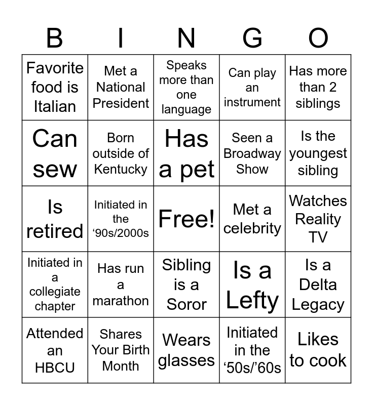 This bingo card has a free space and 32 words: Initiated in the ‘50s/’60s, Initiated in the ‘70s/’80s, Initiated in the ‘90s/2000s, Initiated in the 2010s/’20s, Initiated in a collegiate chapter, Born outside of Kentucky, Has more than 2 siblings, Is a Delta Legacy, Met a National President, Traveled outside of the country this year, Has a pet, Speaks more than one language, Read more than 10 books this year, Taken a solo trip, Met a celebrity, Is the oldest sibling, Attended an HBCU, Is retired, Sibling is a Soror, Has run a marathon, Is a Lefty, Is an only child, Watches Reality TV, Shares Your Birth Month, Likes to cook, Can play an instrument, Seen a Broadway Show, Can sew, Favorite food is Italian, Wears glasses, Not wearing Delta para and Is the youngest sibling.
