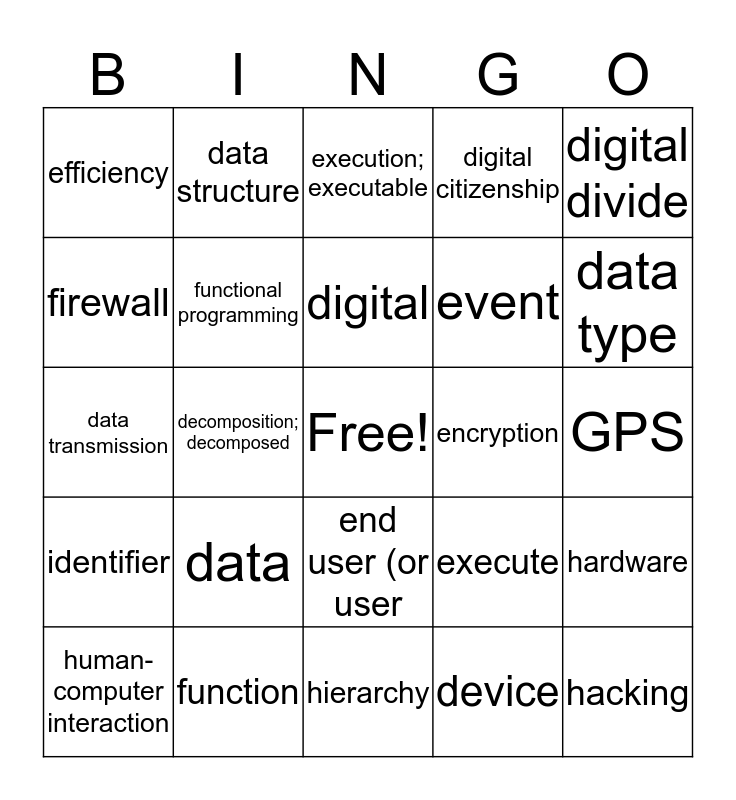 This bingo card has a free space and 24 words: data, function, digital, human-computer interaction, digital divide, efficiency, firewall, data structure, encryption, end user (or user, event, data transmission, execute, hardware, functional programming, device, GPS, execution; executable, data type, decomposition; decomposed, hacking, identifier, digital citizenship and hierarchy.