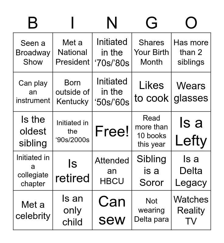 This bingo card has a free space and 32 words: Not wearing Delta para, Is the youngest sibling, Initiated in the ‘90s/2000s, Initiated in the 2010s/’20s, Initiated in a collegiate chapter, Born outside of Kentucky, Has more than 2 siblings, Is a Delta Legacy, Met a National President, Traveled outside of the country this year, Initiated in the ‘50s/’60s, Initiated in the ‘70s/’80s, Has a pet, Speaks more than one language, Read more than 10 books this year, Taken a solo trip, Met a celebrity, Is the oldest sibling, Attended an HBCU, Is retired, Sibling is a Soror, Has run a marathon, Is a Lefty, Is an only child, Watches Reality TV, Shares Your Birth Month, Likes to cook, Can play an instrument, Seen a Broadway Show, Can sew, Favorite food is Italian and Wears glasses.