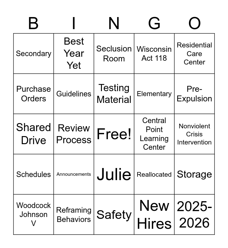 This bingo card has a free space and 53 words: Welcome, 2025-2026, Staffing, New Hires, Announcements, Celebrations, Best Year Yet, Budgets, Purchase Orders, Paula, Guidelines, Resource Room, Storage, Reallocated, IEP Updates, Woodcock Johnson V, Testing Material, Central Point Learning Center, P-1, Residential Care Center, Review Process, Approver, Elementary, Secondary, Aide Supports, Reframing Behaviors, Shortened Day, Manifestations, Expulsion, Pre-Expulsion, School Days, Pattern, Change in Placement, Support Network, Seclusion, Restraint, Wisconsin Act 118, Safety, Seclusion Room, Debrief, Parent Notification, New Forms, Nonviolent Crisis Intervention, Steve, Betsy, Julie, Jamie, Ashley, Shared Drive, Schedules, Questions, Comments and Concerns.
