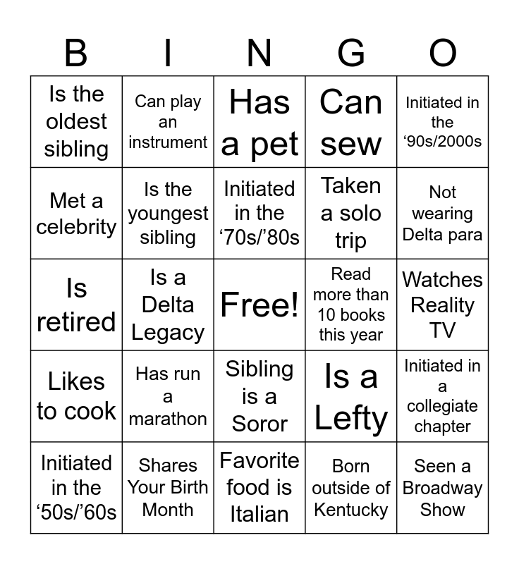 This bingo card has a free space and 32 words: Born outside of Kentucky, Has more than 2 siblings, Is a Delta Legacy, Met a National President, Likes to cook, Is the youngest sibling, Initiated in the ‘90s/2000s, Initiated in a collegiate chapter, Can play an instrument, Traveled outside of the country this year, Initiated in the ‘70s/’80s, Has a pet, Speaks more than one language, Initiated in the 2010s/’20s, Read more than 10 books this year, Attended an HBCU, Initiated in the ‘50s/’60s, Is retired, Sibling is a Soror, Has run a marathon, Is a Lefty, Is an only child, Watches Reality TV, Shares Your Birth Month, Seen a Broadway Show, Can sew, Taken a solo trip, Met a celebrity, Is the oldest sibling, Favorite food is Italian, Wears glasses and Not wearing Delta para.
