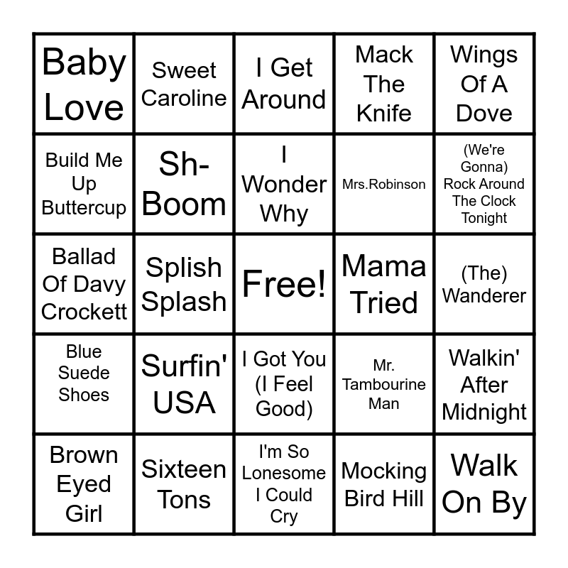 This bingo card has a free space and 74 words: Born To Be Wild, Sixteen Candles, I Wonder Why, Mustang Sally, Walkin' After Midnight, Bad Moon Rising, Shimmy, Shimmy, Ko-Ko-Bop, In The Still Of The Night, Monday, Monday, We Must Have Been Out Of Our Minds, Brown Eyed Girl, Summertime Blues, Mrs.Robinson, Wings Of A Dove, Boy Named Sue, Sixteen Tons, I Can't Help Myself (Sugar Pie, Honey Bunch), Mama Tried, When A Man Loves A Woman, Baby Love, Splish Splash, I Get Around, Mack The Knife, (The) Wanderer, Build Me Up Buttercup, Shout, It's Not Unusual, Maybellene, Wild Thing, Bring It On Home To Me, Sh-Boom, (I Can't Get No) Satisfaction, Mr. Sandman, Wipe Out, Blowin' In The Wind, Son Of A Preacher Man, I'm A Believer, Memories, Walk On By, Big Girls Don't Cry, Stand By Me, I Got You (I Feel Good), Magic Carpet Ride, What A Wonderful World, Bye Bye Love, Sweet Caroline, It's Only Make Believe, Monster Mash, Wake Up Little Susie, Blueberry Hill, Somebody To Love, I Walk the Line, Mr. Tambourine Man, Witch Doctor, Be My Girl, Suspicious Minds, I'm So Lonesome I Could Cry, Magic Moments, Whole Lotta Shakin' Going On, Blue Suede Shoes, Surfin' USA, I'll Be Seeing You, Mocking Bird Hill, Walkin' After Midnight, Ballad Of Davy Crockett, Sugar Sugar, I Got You Babe, Mess Around, (We're Gonna) Rock Around The Clock Tonight, Barbara Ann, Soul Man, I Heard It Through The Grapevine, Make The World Go Away and Why Do Fools Fall In Love.