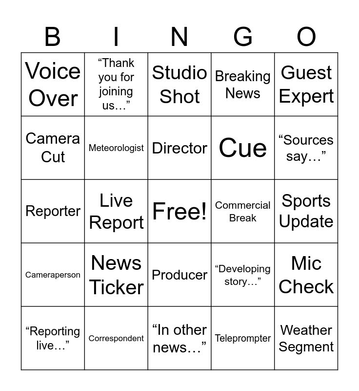 This bingo card has a free space and 40 words: Anchor, Reporter, Field Reporter, Meteorologist, Correspondent, Producer, Director, Interviewee, Guest Expert, Cameraperson, Live Report, Breaking News, Weather Segment, Sports Update, Commercial Break, News Ticker, Graphics Overlay, Voice Over, Sign Off, Studio Shot, Mic Check, Teleprompter, Cue, Camera Cut, Transition, Satellite Feed, Sound Bite, News Package, B-roll, “This just in…”, “Back to you…”, “Reporting live…”, “Stay tuned…”, “Developing story…”, “Sources say…”, “In other news…”, “Good evening…”, “Top story tonight…”, “Thank you for joining us…” and Lower Third.