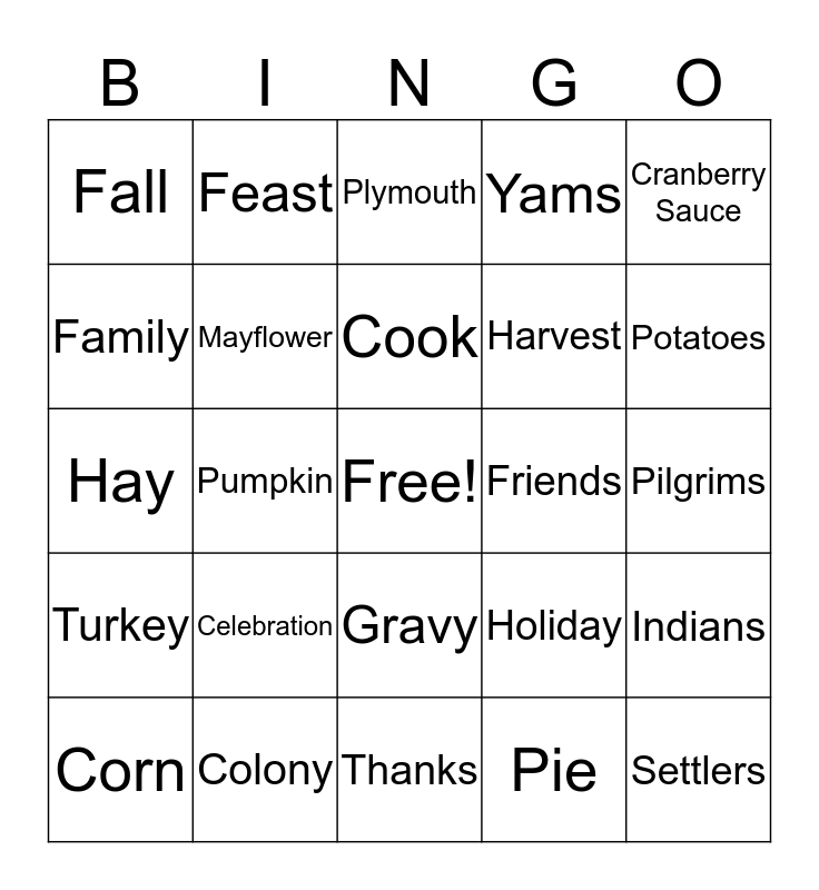 This bingo card has a free space and 24 words: Celebration, Colony, Cook, Corn, Cranberry Sauce, Fall, Family, Feast, Friends, Gravy, Harvest, Hay, Holiday, Indians, Mayflower, Pie, Pilgrims, Plymouth, Potatoes, Pumpkin, Settlers, Turkey, Yams and Thanks.
