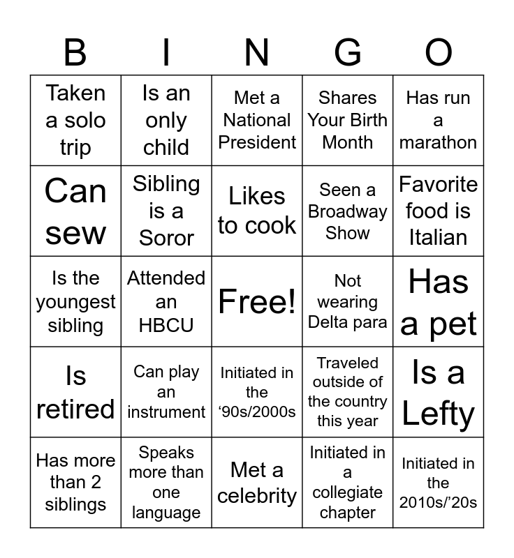 This bingo card has a free space and 32 words: Initiated in a collegiate chapter, Read more than 10 books this year, Attended an HBCU, Initiated in the ‘50s/’60s, Is retired, Sibling is a Soror, Has run a marathon, Is a Lefty, Is an only child, Watches Reality TV, Likes to cook, Met a National President, Wears glasses, Is a Delta Legacy, Not wearing Delta para, Born outside of Kentucky, Has more than 2 siblings, Is the youngest sibling, Initiated in the ‘90s/2000s, Can play an instrument, Traveled outside of the country this year, Initiated in the ‘70s/’80s, Has a pet, Speaks more than one language, Initiated in the 2010s/’20s, Shares Your Birth Month, Seen a Broadway Show, Can sew, Taken a solo trip, Met a celebrity, Is the oldest sibling and Favorite food is Italian.