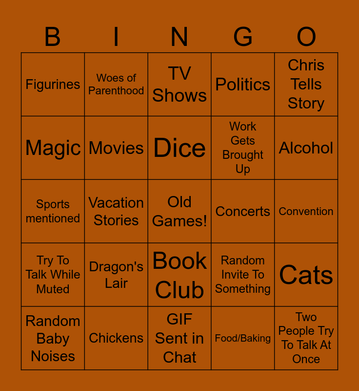 This bingo card has a free space and 24 words: Dragon's Lair, Chickens, Dice, Random Baby Noises, Chris Tells Story, Figurines, Magic, Woes of Parenthood, Concerts, Book Club, Work Gets Brought Up, Sports mentioned, Random Invite To Something, Cats, Movies, Food/Baking, Convention, TV Shows, Alcohol, Vacation Stories, Two People Try To Talk At Once, Try To Talk While Muted, Politics and GIF Sent in Chat.