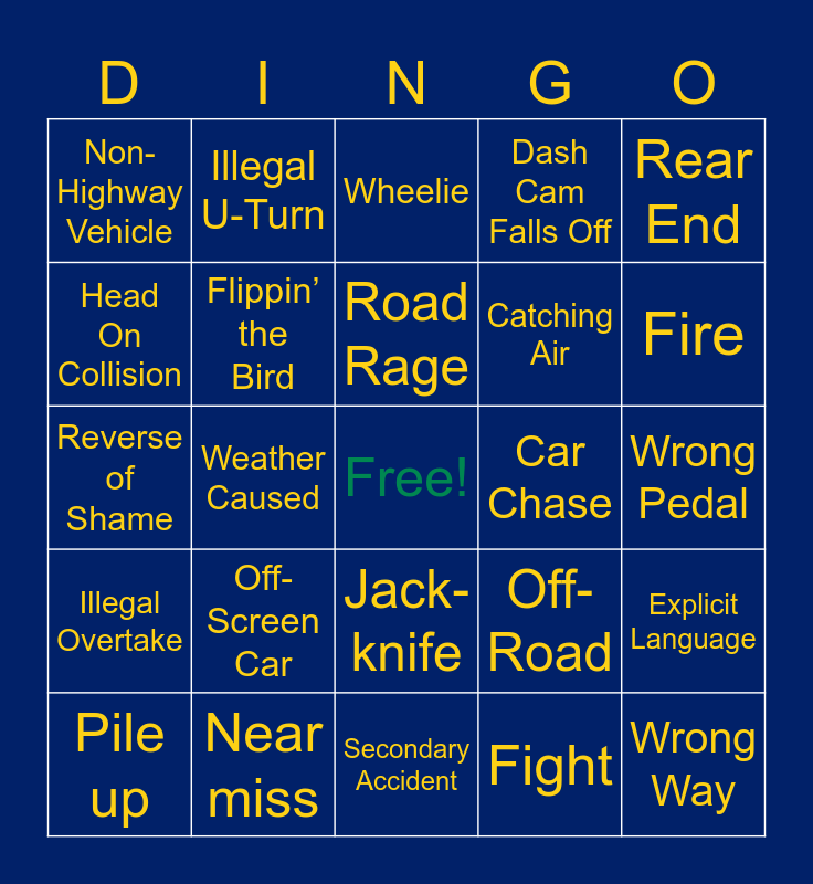 This bingo card has a free space and 46 words: Wildlife, Wrong Way, Woman Screaming, Secondary Accident, Off-Screen Car, Lost Load, Illegal U-Turn, Parked Vehicle, Head On Collision, Rollover, Flippin’ the Bird, Dash Cam Falls Off, Explicit Language, Off-Road, Construction Zone, Brake Check, Road Rage, Car Chase, T-Bone, Rear End, Weather Caused, Fight, Non-Highway Vehicle, Catching Air, Hit N' Run, Fire, Pile up, Missed turn, Jack-knife, Illegal Overtake, Tailgating, Distracted driver, Running Red, Lost a wheel, Slow collision, Near miss, Wrong Pedal, Loud Music, Spotto!, Person on Road, Burnout, Wheelie, Reverse of Shame, Pavement Crawling, Tokyo Drift and DCOA Mention.