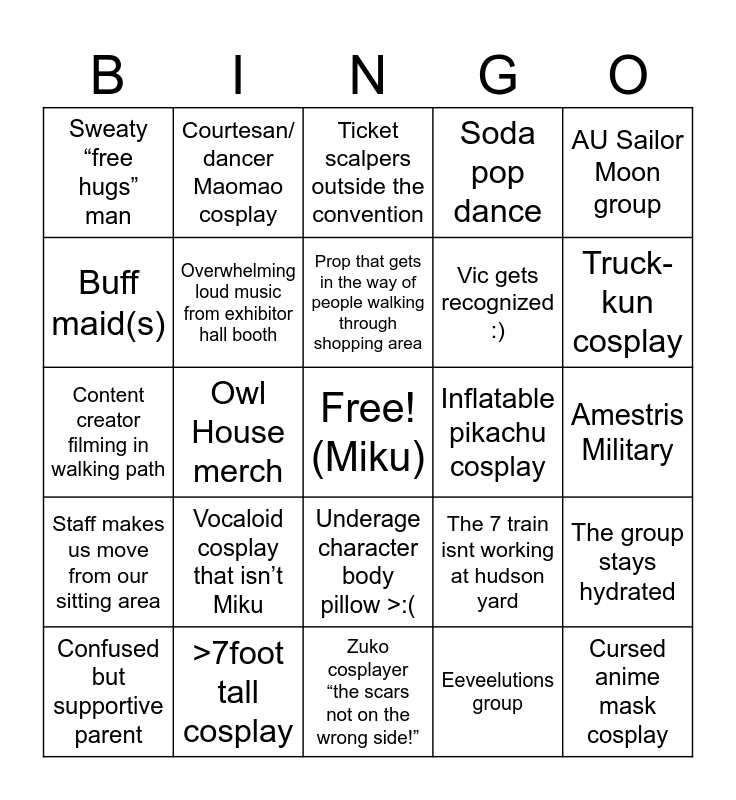 This bingo card has a free space and 24 words: Vocaloid cosplay that isn’t Miku, >7foot tall cosplay, Prop that gets in the way of people walking through shopping area, Confused but supportive parent, AU Sailor Moon group, Sweaty “free hugs” man, Buff maid(s), Courtesan/ dancer Maomao cosplay, Inflatable pikachu cosplay, Underage character body pillow >:(, Vic gets recognized :), Content creator filming in walking path, The 7 train isnt working at hudson yard, The group stays hydrated, Overwhelming loud music from exhibitor hall booth, Eeveelutions group, Amestris Military, Ticket scalpers outside the convention, Truck-kun cosplay, Owl House merch, Cursed anime mask cosplay, Staff makes us move from our sitting area, Soda pop dance and Zuko cosplayer “the scars not on the wrong side!”.