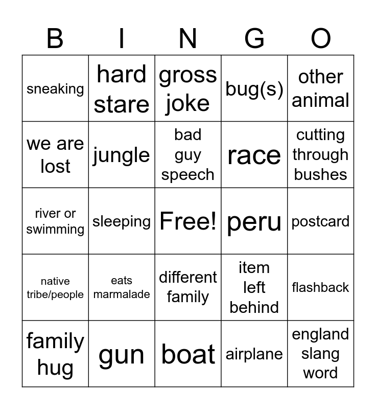 This bingo card has a free space and 24 words: family hug, eats marmalade, bad guy speech, airplane, other animal, sneaking, hard stare, gross joke, peru, postcard, river or swimming, jungle, item left behind, flashback, we are lost, gun, boat, bug(s), cutting through bushes, native tribe/people, sleeping, different family, race and england slang word.