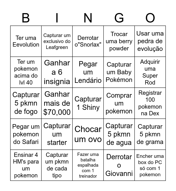This bingo card has a free space and 24 words: Capturar um starter, Capturar um pkmn de cada tipo, Pegar um Lendário, Ensinar 4 HM's para um pokemon, Usar uma pedra de evolução, Ter uma Eevolution, Ter um pokemon acima do lvl 40, Capturar um exclusivo do Leafgreen, Comprar um pokemon, Chocar um ovo, Capturar um Baby Pokémon, Capturar 5 pkmn de fogo, Capturar 5 pkmn de agua, Capturar 5 pkmn de grama, Ganhar a 6 insignia, Derrotar o Giovanni, Registrar 100 pokemon na Dex, Derrotar o"Snorlax", Adquirir uma Super Rod, Ganhar mais de $70,000, Encher uma box do PC só com 1 pokemon, Pegar um pokemon do Safari, Trocar uma berry powder and Fazer uma batalha espalhada com 1 treinador.
