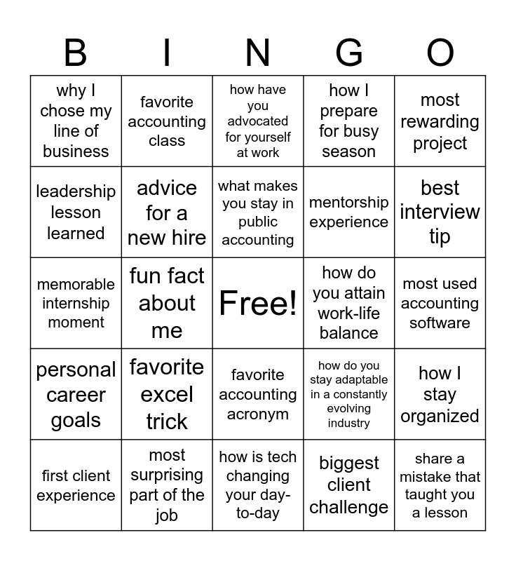 This bingo card has a free space and 24 words: first client experience, favorite excel trick, what makes you stay in public accounting, biggest client challenge, most rewarding project, why I chose my line of business, favorite accounting class, how have you advocated for yourself at work, how do you attain work-life balance, most used accounting software, memorable internship moment, advice for a new hire, how do you stay adaptable in a constantly evolving industry, how I stay organized, leadership lesson learned, most surprising part of the job, how is tech changing your day-to-day, how I prepare for busy season, best interview tip, personal career goals, fun fact about me, favorite accounting acronym, mentorship experience and share a mistake that taught you a lesson.