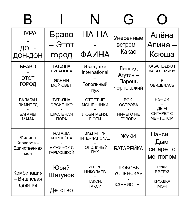 This bingo card has 30 words: Юрий Шатунов - Детство, М.Насыров - Мальчик хочет в тамбов, ТАТЬЯНА ОВСИЕНКО - ШКОЛЬНАЯ ПОРА, ЛЮБЭ - УЛОЧКИ МОСКОВСКИЕ, ШУРА - ДОН-ДОН-ДОН, НА-НА - ФАИНА, ТАТЬЯНА БУЛАНОВА - ЯСНЫЙ МОЙ СВЕТ, ИВАНУШКИ INTERNATIONAL - ТОПОЛИНЫЙ ПУХ, РОК-ОСТРОВА - НИЧЕГО НЕ ГОВОРИ, ИГОРЬ НИКОЛАЕВ - ТАКСИ, ТАКСИ, НЭНСИ - ДЫМ СИГАРЕТ С МЕНТОЛОМ, ОТПЕТЫЕ МОШЕННИКИ - ЛЮБИ МЕНЯ, ЛЮБИ, ЛЮБОВЬ УСПЕНСКАЯ - КАБРИОЛЕТ, РУКИ ВВЕРХ! - КРОШКА МОЯ, КАБАРЕ-ДУЭТ «АКАДЕМИЯ» - Я ОБИДЕЛАСЬ, ТАТЬЯНА ОВСИЕНКО - ШКОЛЬНАЯ ПОРА, ЖУКИ - БАТАРЕЙКА, Филипп Киркоров – Единственная моя, НАТАША КОРОЛЁВА - МУЖИЧОК С ГАРМОШКОЙ, Алёна Апина – Ксюша, БАЛАГАН ЛИМИТЕД - БАГАМЫ МАМА, Андрей Губин – Мальчик-бродяга, Браво – Этот город, Леонид Агутин – Парень чернокожий, БРАВО - ЭТОТ ГОРОД, Унесённые ветром – Какао, Нэнси – Дым сигарет с ментолом, Комбинация – Вишнёвая девятка, Иванушки International – Тополиный пух and Отпетые мошенники – Люби меня, люби.