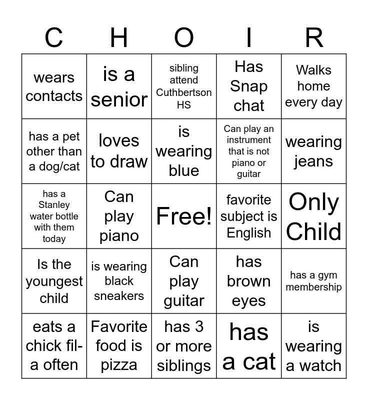This bingo card has a free space and 69 words: Born in Another Country, Only Child, Has visited a country outside of the US, Oldest Child, Favorite food is pizza, Has an instagram account, Has Snap chat, Has a facebook account, Walks home every day, plays sports, has a gym membership, wears glasses, wears contacts, sibling attend Cuthbertson HS, Sibling attend Cuthbertson Middle, Can play piano, Can play guitar, Can play an instrument that is not piano or guitar, is the middle child, Is the youngest child, favorite subject is English, has brown eyes, wearing jeans, has on a red shirt, has an eye color besides brown, is left-handed, has curly hair, has a dog, has a cat, first semester in chorus, is a senior, is a sophmore, is a junior, is a freshman, has been in choir every semester since 9th grade, Rides the bus, drives your own car to school, has your learner's permit, has a pet other than a dog/cat, has ears pierced, is wearing black sneakers, is wearing a watch, is wearing CHS spiritwear, went to an amusement park this summer, loves mexican food, eats a chick fil-a often, is a Buc-ees super fan, went to the beach, saw a musical this summer or past year, loves to draw, is wearing blue, new to CHS this year, went to the movies this summer, has 3 or more siblings, can speak more than one language, has a birthday in August, has a birthday in September, had a birthday in June or July, drinks coffee, has a Stanley water bottle with them today, had a Dunkin Donut this morning, shops at Target, lives in Waxhaw, lives in Wesley Chapel, visited a college this summer, knows what PMO means, went snorkeling this summer, rode a boat this summer and rode a bicycle this summer.