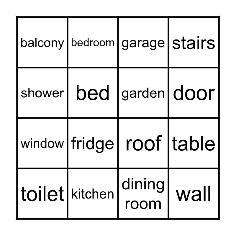 This bingo card has 21 words: kitchen, bathroom, bedroom, living room, dining room, garden, balcony, garage, roof, door, window, stairs, wall, floor, bed, sofa, toilet, fridge, shower, table and chair.