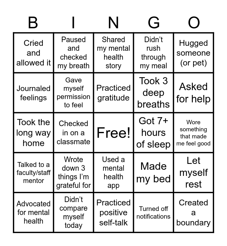 This bingo card has a free space and 96 words: Breathed deeply, Drank water, Ate a full meal, Got 7+ hours of sleep, Took a walk, Meditated, Stretched or did yoga, Took a social media break, Said “no” to something, Took a nap, Talked to a friend, Sent a check-in text, Complimented someone, Asked for help, Scheduled therapy, Journaled feelings, Practiced gratitude, Laughed out loud, Listened to music, Danced, Watched a comfort show, Read something non-academic, Took a study break, Used a grounding technique, Used a mental health app, Practiced positive self-talk, Said “I’m struggling”, Cried and allowed it, Gave myself grace, Took meds on time, Helped a peer, Made my bed, Organized my space, Went outside, Hugged someone (or pet), Celebrated a small win, Let myself rest, Cooked or ordered a good meal, Skipped studying to rest, Checked in on a classmate, Left a toxic group chat, Advocated for mental health, Created a boundary, Didn’t compare myself today, Talked to a faculty/staff mentor, Shared my mental health story, Felt proud of myself, Was kind to myself, Said “I’m enough”, Listened without fixing, Checked in with myself, Said “I need a break”, Listened to my body, Took a screen break, Canceled plans for rest, Stayed in the moment, Shared how I really feel, Affirmed myself, Didn’t overcommit, Watched the sunrise/sunset, Spoke kindly to myself, Slept without guilt, Took time to breathe, Texted someone “I appreciate you”, Closed my laptop early, Created a to-do list I can handle, Had a slow morning, Said “that’s enough for today”, Accepted not being perfect, Turned off notifications, Let myself feel joy, Checked in with a peer, Practiced a hobby, Expressed what I need, Didn’t apologize for resting, Talked to a mentor, Named my emotions, Gave myself permission to feel, Let myself cry, Took 3 deep breaths, Didn’t rush through my meal, Avoided toxic productivity, Smiled at someone, Watched something funny, Did one thing just for fun, Took the long way home, Wrote down 3 things I’m grateful for, Let go of a small stressor, Acknowledged my hard work, Wore something that made me feel good, Set a small, realistic goal, Celebrated showing up, Did something without pressure to be “good” at it, Created a calming playlist, Paused and checked my breath and Believed I’m enough today.