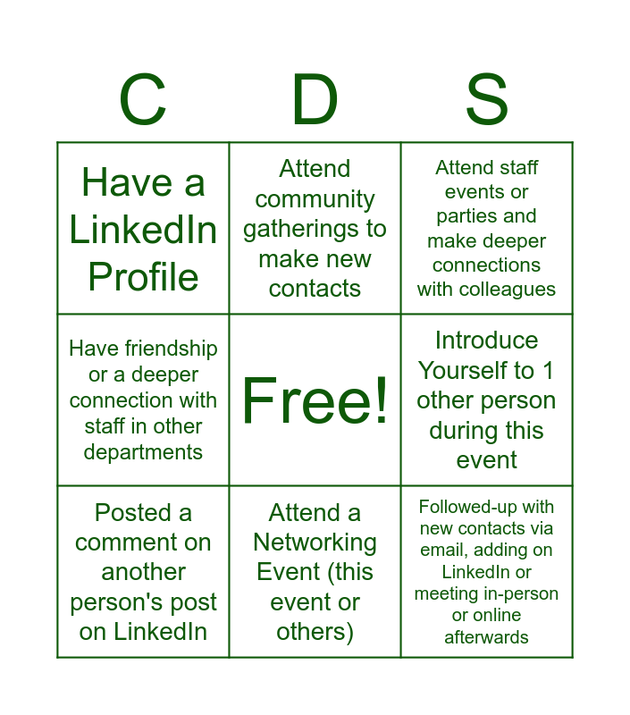 This bingo card has a free space and 8 words: Introduce Yourself to 1 other person during this event, Attend staff events or parties and make deeper connections with colleagues, Attend community gatherings to make new contacts, Posted a comment on another person's post on LinkedIn, Have a LinkedIn Profile, Followed-up with new contacts via email, adding on LinkedIn or meeting in-person or online afterwards, Have friendship or a deeper connection with staff in other departments and Attend a Networking Event (this event or others).