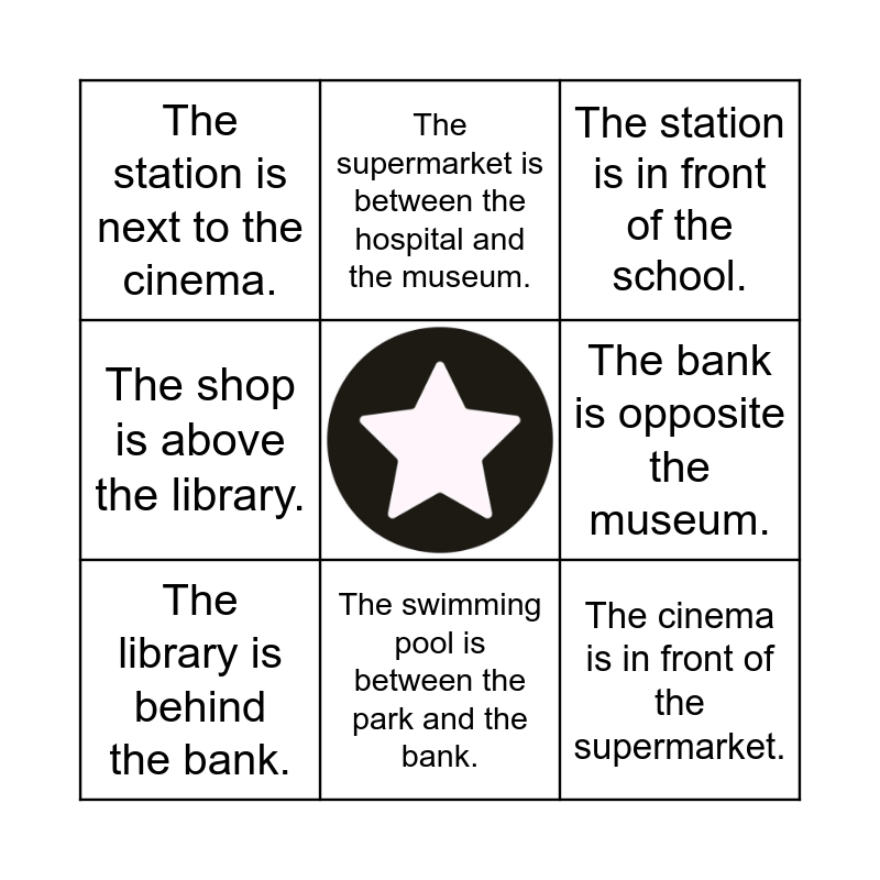 This bingo card has a free space and 14 words: The park is opposite the cinema., The hospital is next to the school., The library is behind the bank., The supermarket is between the hospital and the museum., The shop is above the library., The cinema is in front of the supermarket., The library is next to the cinema., The park is in front of the school., The swimming pool is between the park and the bank., The station is next to the cinema., The swimming pool is next to the park., The bank is opposite the museum., The station is in front of the school. and The restaurant is above the cinema..