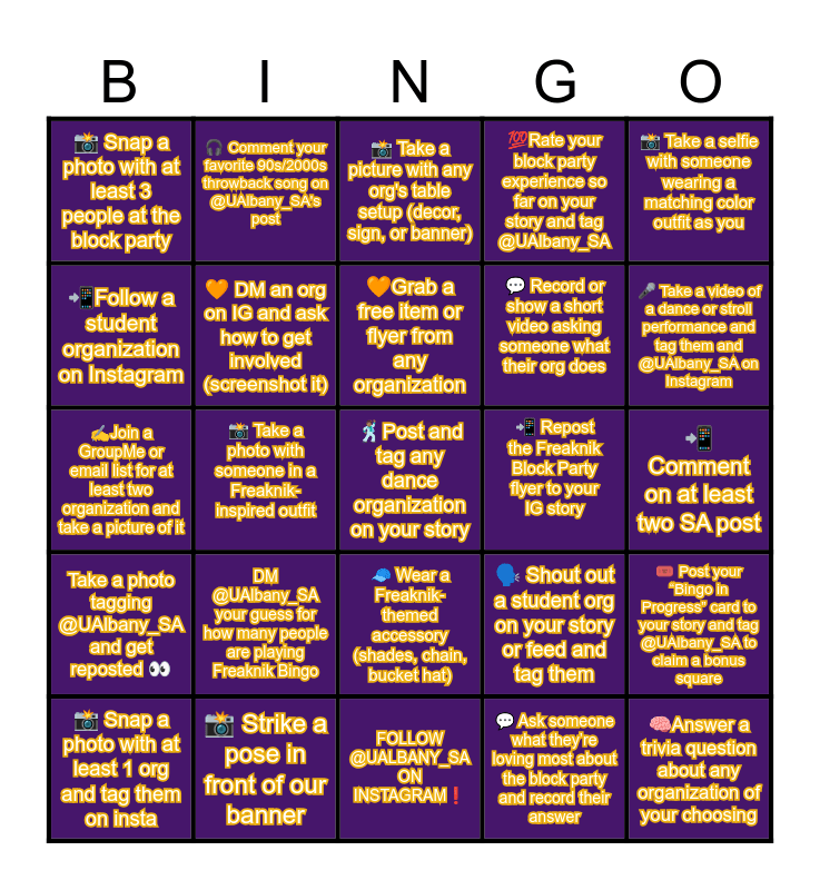 This bingo card has 25 words: Take a photo tagging @UAlbany_SA and get reposted 👀, 📸 Strike a pose in front of our banner, 🕺🏽Post and tag any dance organization on your story, 💬 Ask someone what they’re loving most about the block party and record their answer, 📸 Take a selfie with someone wearing a matching color outfit as you, 📸 Snap a photo with at least 3 people at the block party, 🎧 Comment your favorite 90s/2000s throwback song on @UAlbany_SA's post, 📸 Take a picture with any org's table setup (decor, sign, or banner), 📲 Repost the Freaknik Block Party flyer to your IG story, 🎟️ Post your “Bingo in Progress” card to your story and tag @UAlbany_SA to claim a bonus square, 📲Follow a student organization on Instagram, 🧡 DM an org on IG and ask how to get involved (screenshot it), FOLLOW @UALBANY_SA ON INSTAGRAM❗, 🗣️ Shout out a student org on your story or feed and tag them, 🎤 Take a video of a dance or stroll performance and tag them and @UAlbany_SA on Instagram, 📸 Snap a photo with at least 1 org and tag them on insta, 📸 Take a photo with someone in a Freaknik-inspired outfit, 🧡Grab a free item or flyer from any organization, 💬 Record or show a short video asking someone what their org does, 📲Comment on at least two SA post, ✍️Join a GroupMe or email list for at least two organization and take a picture of it, DM @UAlbany_SA your guess for how many people are playing Freaknik Bingo, 🧢 Wear a Freaknik-themed accessory (shades, chain, bucket hat), 💯Rate your block party experience so far on your story and tag @UAlbany_SA and 🧠Answer a trivia question about any organization of your choosing.