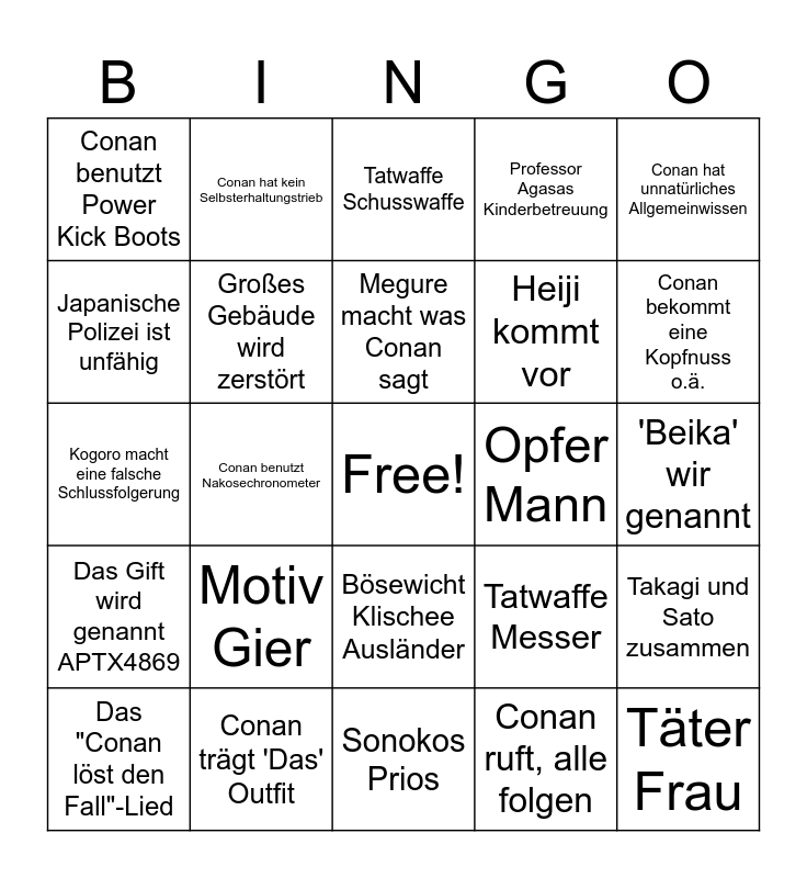 This bingo card has a free space and 55 words: Jemand sagt "Ruft einen Krankenwagen", Das "Conan löst den Fall"-Lied, Conan benutzt Brille, Conan benutzt Power Kick Boots, Sonokos Prios, Ran benutzt ihre Fähigkeiten, Großes Gebäude wird zerstört, Kaito Kid wird genannt, Heiji kommt vor, Die Detektive Boys haben keine Eltern, Professor Agasas Kinderbetreuung, Mori raucht oder trinkt, Conan benimmt sich wie ein Kind, Ai benimmt sich nicht wie ein Kind, Schwarze Organisation wird genannt, Yoko Ono wird genannt, Conan hat unnatürliches Allgemeinwissen, Conan benutzt Nakosechronometer, Täter Mann, Täter Frau, Opfer Mann, Opfer Frau, Tatwaffe Messer, Tatwaffe Schusswaffe, Tatwaffe Gift, Megure macht was Conan sagt, Conan ruft, alle folgen, Suzuki Konzern wir genannt, 'Beika' wir genannt, Takagi und Sato zusammen, Kogoro hat einen Fall, Ran ist übermäßig emotional, Shinichi wird erwähnt, Conan beleidigt in Gedanken jemanden, Japanische Polizei ist unfähig, Kogoro macht eine falsche Schlussfolgerung, Genta fragt nach Aal auf Reis, Das Gift wird genannt APTX4869, Jemand Prominentes taucht auf, Ran in Lebensgefahr, Conan hat kein Selbsterhaltungstrieb, Kogoro mietet Auto, Conan gibt einen Hinweis, Motiv Rache, Motiv Gier, Conan trägt 'Das' Outfit, Conan geht aufs Klo, Unlogik, Kogoro ist peinlich, Conan bekommt eine Kopfnuss o.ä., Ai benimmt sich wie Ehefrau, Heiji taucht auf, Waffe Bombe, Bösewicht Klischee Ausländer and Bösewicht ewiger Monolog.