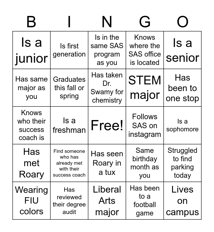 This bingo card has a free space and 24 words: Find someone who has already met with their success coach, Has reviewed their degree audit, Has taken Dr. Swamy for chemistry, Wearing FIU colors, Is a senior, Is a junior, Has same major as you, Is first generation, Follows SAS on instagram, Has seen Roary in a tux, STEM major, Knows who their success coach is, Same birthday month as you, Struggled to find parking today, Graduates this fall or spring, Has been to a football game, Is a sophomore, Is in the same SAS program as you, Has been to one stop, Is a freshman, Lives on campus, Has met Roary, Knows where the SAS office is located and Liberal Arts major.