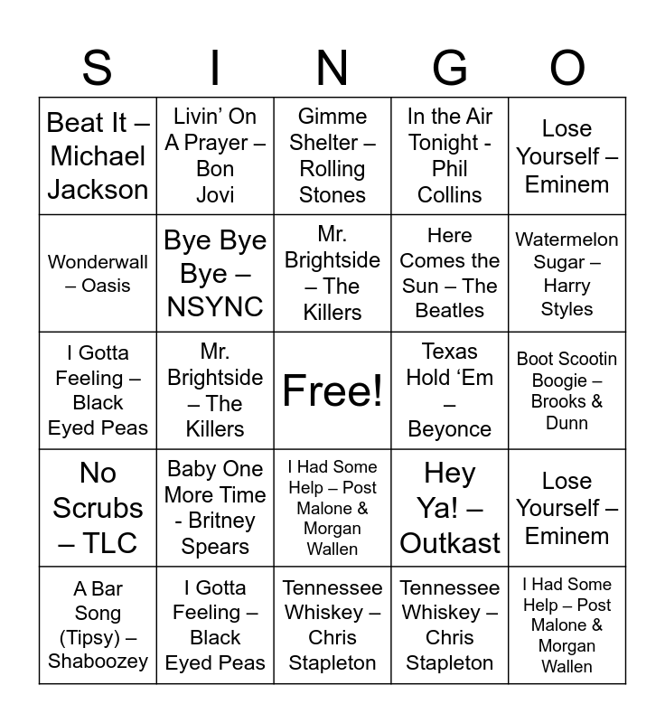 ⚠ This card has duplicate items: Here Comes the Sun – The Beatles (2), Good Vibrations – The Beach Boys (2), Gimme Shelter – Rolling Stones (2), Light My Fire – The Doors (2), Dancing Queen – ABBA (2), (Don’t Fear) The Reaper – Blue Oyster Cult (2), My Best Friend’s Girl – The Cars (2), Dreams – Fleetwood Mac (2), Let’s Stay Together - Al Green (2), Don’t Stop Believin’ – Journey (2), Walking on Sunshine – Katrina & The Waves (2), Livin’ On A Prayer – Bon Jovi (2), In the Air Tonight - Phil Collins (2), Beat It – Michael Jackson (2), Amarillo By Morning – George Strait (2), Wonderwall – Oasis (2), Smells Like Teen Spirit – Nirvana (2), Baby One More Time - Britney Spears (2), Iris - Goo Goo Dolls (2), Boot Scootin Boogie – Brooks & Dunn (2), No Scrubs – TLC (2), Lose Yourself – Eminem (2), I Gotta Feeling – Black Eyed Peas (2), Mr. Brightside – The Killers (2), Bye Bye Bye – NSYNC (2), Hey Ya! – Outkast (2), Confessions Part II – Usher (2), Happy – Pharrell Williams (2), Blinding Lights – The Weeknd (2), Uptown Funk – Bruno Mars (2), Watermelon Sugar – Harry Styles (2), Hello – Adele (2), Tennessee Whiskey – Chris Stapleton (2), Anti-Hero – Taylor Swift (2), A Bar Song (Tipsy) – Shaboozey (2), Texas Hold ‘Em – Beyonce (2), Pink Pony Club – Chappell Roan (2), Espresso - Sabrina Carpenter (2), I Ain’t Worried – OneRepublic (2), I Had Some Help – Post Malone & Morgan Wallen (2)