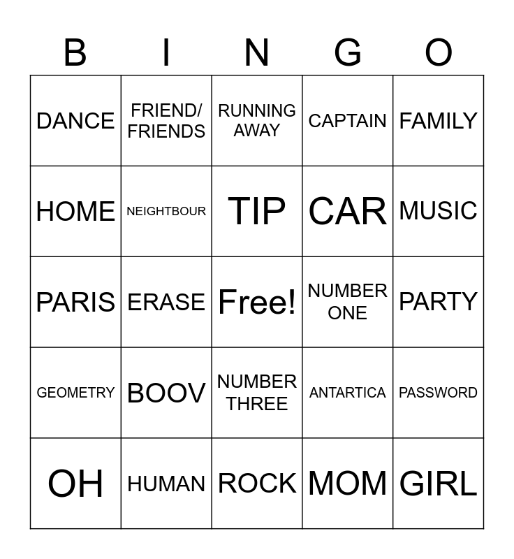 This bingo card has a free space and 24 words: BOOV, HUMAN, TIP, OH, FAMILY, DANCE, HOME, FRIEND/ FRIENDS, NUMBER ONE, NUMBER THREE, CAR, PARIS, ANTARTICA, PASSWORD, NEIGHTBOUR, MOM, PARTY, RUNNING AWAY, MUSIC, ERASE, GIRL, GEOMETRY, CAPTAIN and ROCK.