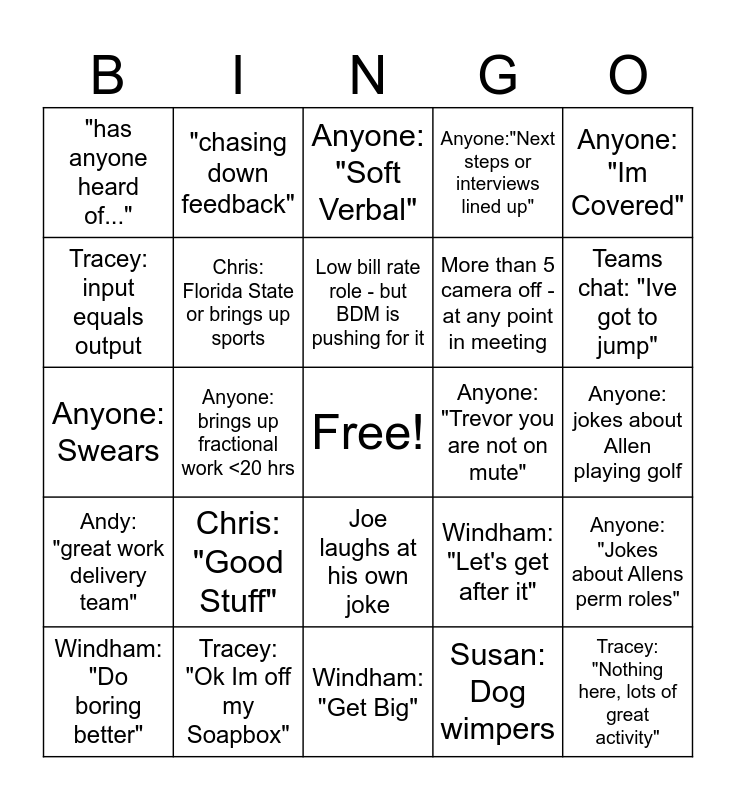 This bingo card has a free space and 29 words: Windham: "Do boring better", Kelly: Putting it into bullhorn as we speak, Anyone: brings up fractional work <20 hrs, Tracey: "Love all the activity", "has anyone heard of...", Anyone: "Soft Verbal", Chris: Florida State or brings up sports, Chris: "Good Stuff", Anyone: "Trevor you are not on mute", Tracey: "Ok Im off my Soapbox", Anyone: jokes about Allen playing golf, Tracey: "Nothing here, lots of great activity", Windham: "Get Big", Susan: Dog wimpers, Teams chat: "Ive got to jump", More than 10 hats in a meeting, Joe laughs at his own joke, Andy: "great work delivery team", Anyone: "Im Covered", Anyone: Swears, Windham: "Let's get after it", MB: "Good morning beautiful people", More than 5 camera off - at any point in meeting, Tracey: input equals output, Anyone:"Next steps or interviews lined up", "chasing down feedback", Anyone: "Jokes about Allens perm roles", Low bill rate role - but BDM is pushing for it and Two candidates in but would take more.