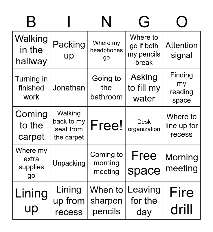 This bingo card has a free space and 25 words: Unpacking, When to sharpen pencils, Going to the bathroom, Lining up, Attention signal, Walking in the hallway, Turning in finished work, Packing up, Desk organization, Coming to morning meeting, Asking to fill my water, Coming to the carpet, Free space, Morning meeting, Jonathan, Asking for help during work, Where to line up for recess, Where my headphones go, Finding my reading space, Walking back to my seat from the carpet, Fire drill, Lining up from recess, Where my extra supplies go, Where to go if both my pencils break and Leaving for the day.