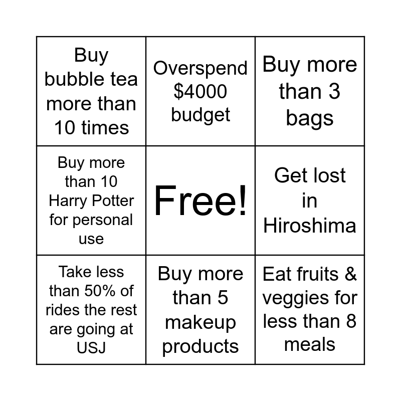 This bingo card has a free space and 8 words: Get lost in Hiroshima, Buy more than 3 bags, Overspend $4000 budget, Take less than 50% of rides the rest are going at USJ, Buy bubble tea more than 10 times, Eat fruits & veggies for less than 8 meals, Buy more than 10 Harry Potter for personal use and Buy more than 5 makeup products.