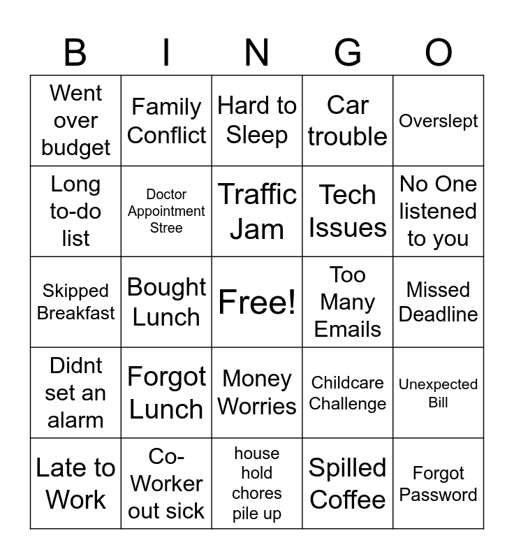 This bingo card has a free space and 24 words: Late to Work, Forgot Lunch, Traffic Jam, Spilled Coffee, Overslept, Went over budget, Family Conflict, Hard to Sleep, Too Many Emails, Missed Deadline, Skipped Breakfast, Doctor Appointment Stree, Childcare Challenge, Unexpected Bill, Long to-do list, Co-Worker out sick, house hold chores pile up, Car trouble, No One listened to you, Didnt set an alarm, Bought Lunch, Money Worries, Tech Issues and Forgot Password.