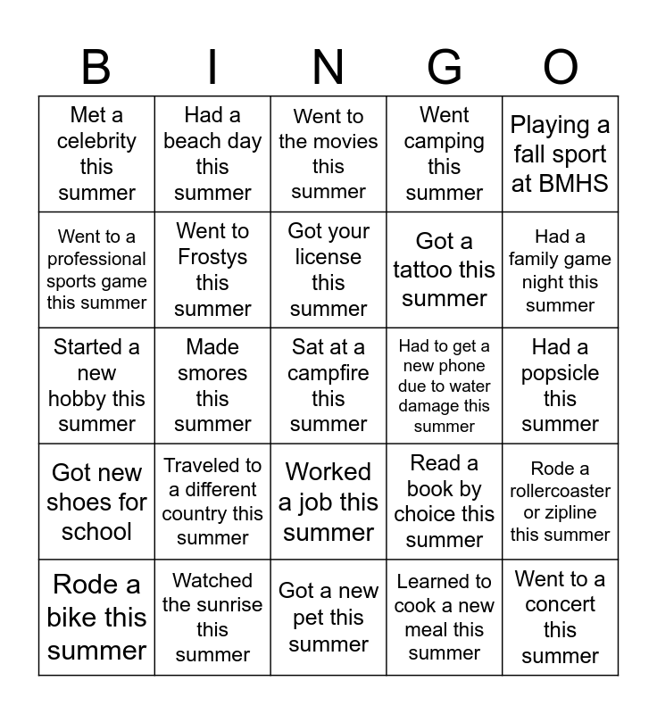 This bingo card has 25 words: Traveled to a different country this summer, Got a new pet this summer, Got your license this summer, Rode a bike this summer, Playing a fall sport at BMHS, Met a celebrity this summer, Went to a professional sports game this summer, Had a beach day this summer, Had to get a new phone due to water damage this summer, Worked a job this summer, Got a tattoo this summer, Started a new hobby this summer, Read a book by choice this summer, Rode a rollercoaster or zipline this summer, Went to Frostys this summer, Went to a concert this summer, Had a popsicle this summer, Went to the movies this summer, Had a family game night this summer, Made smores this summer, Sat at a campfire this summer, Watched the sunrise this summer, Got new shoes for school, Went camping this summer and Learned to cook a new meal this summer.