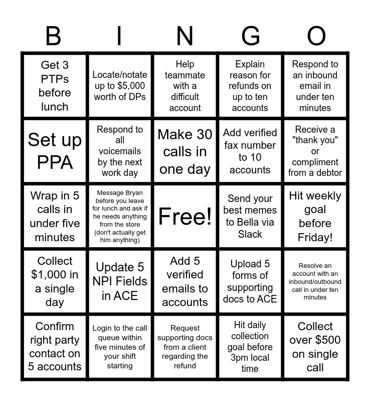 This bingo card has a free space and 24 words: Update 5 NPI Fields in ACE, Login to the call queue within five minutes of your shift starting, Make 30 calls in one day, Confirm right party contact on 5 accounts, Respond to an inbound email in under ten minutes, Get 3 PTPs before lunch, Set up PPA, Locate/notate up to $5,000 worth of DPs, Send your best memes to Bella via Slack, Add 5 verified emails to accounts, Add verified fax number to 10 accounts, Wrap in 5 calls in under five minutes, Upload 5 forms of supporting docs to ACE, Resolve an account with an inbound/outbound call in under ten minutes, Respond to all voicemails by the next work day, Hit daily collection goal before 3pm local time, Hit weekly goal before Friday!, Help teammate with a difficult account, Receive a "thank you" or compliment from a debtor, Message Bryan before you leave for lunch and ask if he needs anything from the store (don't actually get him anything), Collect over $500 on single call, Collect $1,000 in a single day, Explain reason for refunds on up to ten accounts and Request supporting docs from a client regarding the refund.