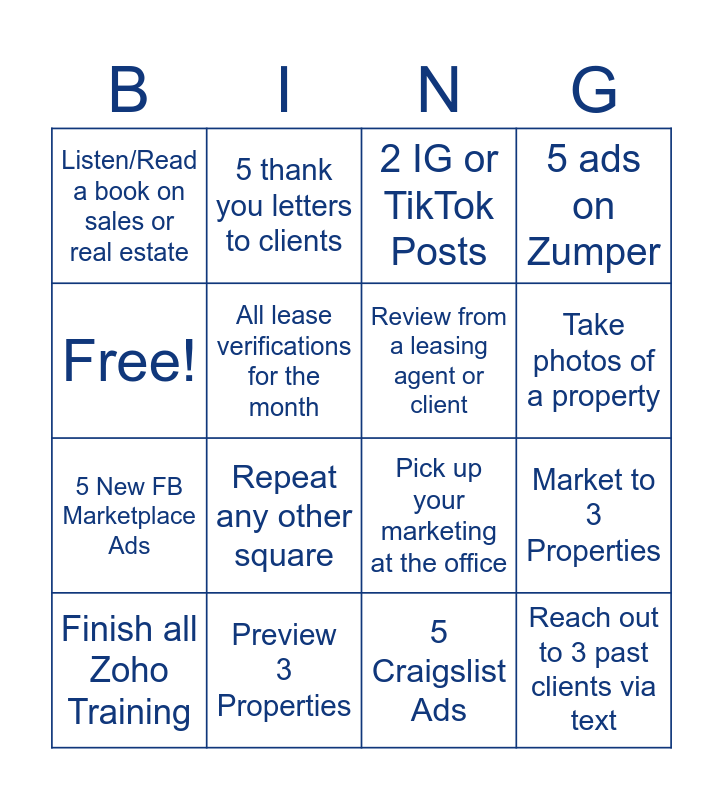 This bingo card has 16 words: Preview 3 Properties, Market to 3 Properties, 2 IG or TikTok Posts, Listen/Read a book on sales or real estate, 5 New FB Marketplace Ads, 5 thank you letters to clients, Pick up your marketing at the office, 5 Craigslist Ads, Free!, All lease verifications for the month, Finish all Zoho Training, 5 ads on Zumper, Repeat any other square, Take photos of a property, Review from a leasing agent or client and Reach out to 3 past clients via text.
