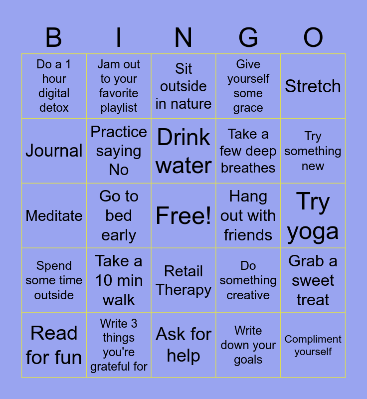 This bingo card has a free space and 24 words: Take a 10 min walk, Write 3 things you're grateful for, Drink water, Read for fun, Stretch, Do a 1 hour digital detox, Journal, Jam out to your favorite playlist, Hang out with friends, Retail Therapy, Take a few deep breathes, Meditate, Do something creative, Grab a sweet treat, Practice saying No, Write down your goals, Try yoga, Sit outside in nature, Try something new, Go to bed early, Compliment yourself, Spend some time outside, Give yourself some grace and Ask for help.
