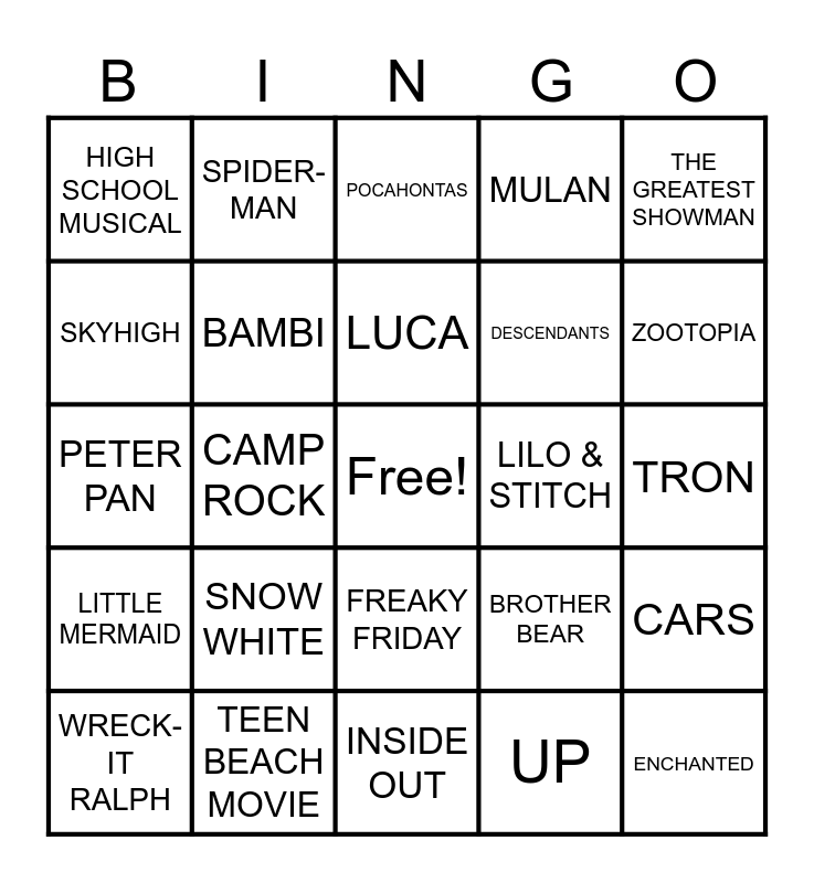 This bingo card has a free space and 64 words: BIG HERO 6, MOANA, MOANA 2, CARS, CINDERELLA, STARWARS, SPIDER-MAN, ONWARD, LUCA, RIO, FREAKY FRIDAY, A BUGS LIFE, TRON, THE GREATEST SHOWMAN, ZOMBIES, SKYHIGH, CAMP ROCK, HIGH SCHOOL MUSICAL, AVATAR, DESCENDANTS, SNOW WHITE, LITTLE MERMAID, MULAN, THE JUNGLE BOOK, THE LION KING, MUFASA, BEAUTY AND THE BEAST, ALADDIN, FROZEN, TANGLED, ENCANTO, COCO, RAYA, WISH, ZOOTOPIA, WRECK-IT RALPH, BOLT, UP, HERCULES, BAMBI, PETER PAN, LILO & STITCH, TARZAN, ALICE IN WONDERLAND, DUMBO, ENCHANTED, TEEN BEACH MOVIE, NARNIA, BROTHER BEAR, ELEMENTAL, FINDING NEMO, INCREDIBLES, INSIDE OUT, TOY STORY, MONSTERS INC., OLIVER AND COMPANY, POCAHONTAS, WALL-E, SLEEPING BEAUTY, RATATOUILLE, LADY AND THE TRAMP, ROBIN HOOD, TINKERBELL and PINOCCHIO.