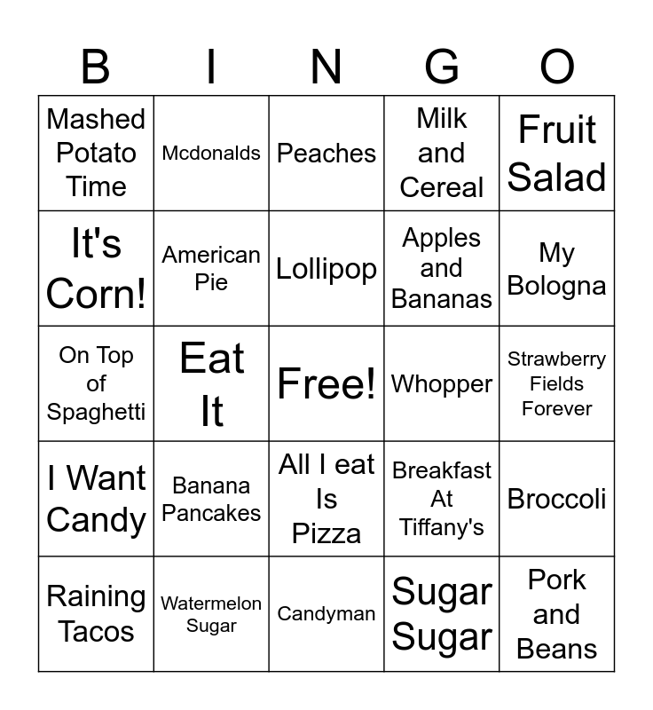 This bingo card has a free space and 24 words: Banana Pancakes, Watermelon Sugar, Lollipop, Raining Tacos, Fruit Salad, Mashed Potato Time, It's Corn!, Mcdonalds, Whopper, All I eat Is Pizza, Apples and Bananas, On Top of Spaghetti, Breakfast At Tiffany's, Broccoli, American Pie, Sugar Sugar, Strawberry Fields Forever, Peaches, My Bologna, Eat It, Pork and Beans, I Want Candy, Milk and Cereal and Candyman.