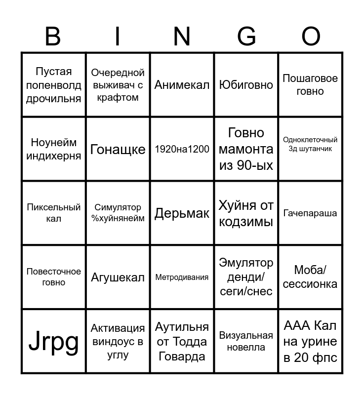This bingo card has a free space and 24 words: Агушекал, Активация виндоус в углу, 1920на1200, Jrpg, Пошаговое говно, Пустая попенволд дрочильня, Ноунейм индихерня, Очередной выживач с крафтом, Хуйня от кодзимы, Метродивания, Говно мамонта из 90-ых, Пиксельный кал, Эмулятор денди/сеги/снес, Моба/сессионка, Гонащке, Визуальная новелла, Гачепараша, Анимекал, Одноклеточный 3д шутанчик, Симулятор %хуйнянейм, ААА Кал на урине в 20 фпс, Повесточное говно, Юбиговно and Аутильня от Тодда Говарда.