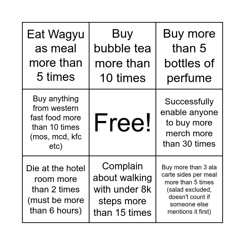 This bingo card has a free space and 8 words: Successfully enable anyone to buy more merch more than 30 times, Buy more than 5 bottles of perfume, Buy bubble tea more than 10 times, Die at the hotel room more than 2 times (must be more than 6 hours), Eat Wagyu as meal more than 5 times, Buy more than 3 ala carte sides per meal more than 5 times (salad excluded, doesn't count if someone else mentions it first), Buy anything from western fast food more than 10 times (mos, mcd, kfc etc) and Complain about walking with under 8k steps more than 15 times.