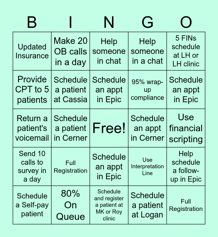 This bingo card has a free space and 24 words: Full Registration, 80% On Queue, Schedule an appt in Epic, Schedule a Self-pay patient, 5 FINs schedule at LH or LH clinic, Updated Insurance, Provide CPT to 5 patients, Make 20 OB calls in a day, Schedule an appt in Cerner, Schedule an appt in Epic, 95% wrap-up compliance, Return a patient's voicemail, Use Interpretation Line, Help schedule a follow-up in Epic, Schedule a patient at Cassia, Schedule a patient at Logan, Use financial scripting, Help someone in chat, Schedule an appt in Epic, Schedule a patient in Cerner, Full Registration, Send 10 calls to survey in a day, Help someone in a chat and Schedule and register a patient at MK or Roy clinic.