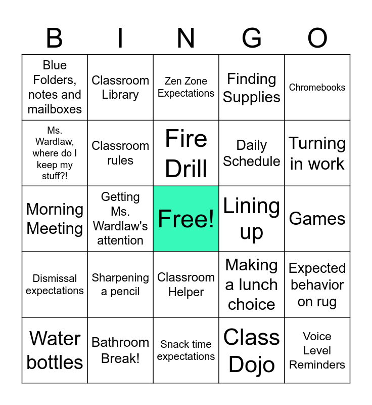 This bingo card has a free space and 24 words: Sharpening a pencil, Bathroom Break!, Fire Drill, Water bottles, Chromebooks, Blue Folders, notes and mailboxes, Ms. Wardlaw, where do I keep my stuff?!, Classroom Library, Lining up, Classroom Helper, Daily Schedule, Morning Meeting, Making a lunch choice, Expected behavior on rug, Classroom rules, Class Dojo, Games, Zen Zone Expectations, Turning in work, Getting Ms. Wardlaw's attention, Voice Level Reminders, Dismissal expectations, Finding Supplies and Snack time expectations.