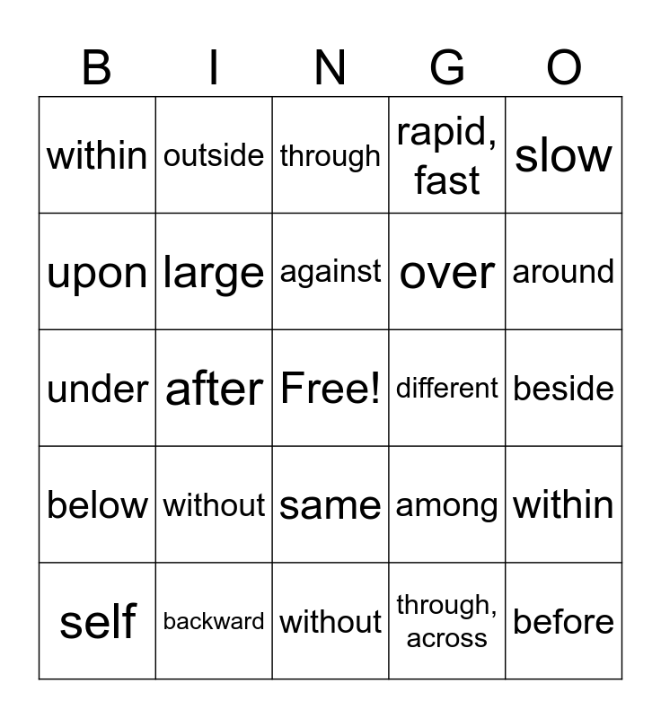 This bingo card has a free space and 25 words: without, without, against, self, slow, within, upon, outside, different, same, over, under, among, within, large, small, beside, through, around, after, before, backward, below, rapid, fast and through, across.