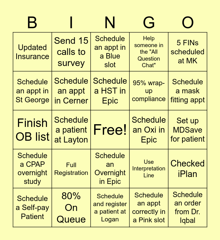 This bingo card has a free space and 24 words: Full Registration, 80% On Queue, Schedule a HST in Epic, Schedule a Self-pay Patient, 5 FINs scheduled at MK, Updated Insurance, Schedule an appt in St George, Send 15 calls to survey, Schedule an Oxi in Epic, Schedule an Overnight in Epic, 95% wrap-up compliance, Finish OB list, Use Interpretation Line, Checked iPlan, Schedule an appt in Cerner, Schedule an appt correctly in a Pink slot, Set up MDSave for patient, Schedule an appt in a Blue slot, Schedule a mask fitting appt, Schedule a patient at Layton, Schedule an order from Dr. Iqbal, Schedule a CPAP overnight study, Help someone in the "All Question Chat" and Schedule and register a patient at Logan.