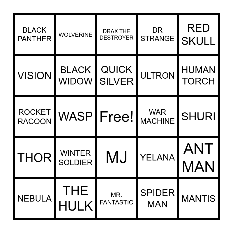 This bingo card has a free space and 59 words: IRON MAN, THE HULK, CAPTAIN AMERICA, THOR, SPIDER MAN, THANOS, BLACK WIDOW, LOKI, ULTRON, ANCIENT ONE, DR STRANGE, GROOT, VISION, GAMORA, NICK FURY, BLACK PANTHER, MANTIS, RED SKULL, STAR LORD, QUICK SILVER, WAR MACHINE, DRAX THE DESTROYER, NEBULA, ANT MAN, SCARLET WITCH, AGATHA HARKNESS, HAWKEYE, INVISIBLE WOMEN, HUMAN TORCH, ROGUE, JEAN GREY, DR. DOOM, CAPTAIN MARVEL, GALACTUS, WOLVERINE, STORM, ADAM WARLOCK, WASP, JARVIS, ROCKET RACOON, FALCON, WINTER SOLDIER, SHURI, LOKI, HELA, ODIN, JANE FOSTER, AUNT MAY, MJ, MR. FANTASTIC, THING, SILVER SURFER, WICCAN, KATE BISHOP, PEPPER POTS, YELANA, DEADPOOL, RED GUARDIAN and MYSTIQUE.